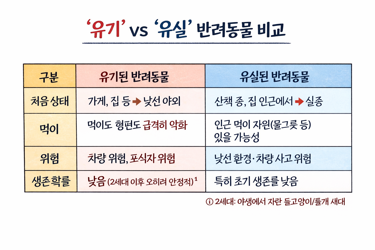 마지막으로 혼자 있음 자체가 생존 실패의 시작이다. 유실묘 중 상당수는 먹이가 있어도 숨어만 있다가 쇠약해진 채 발견된다. 고양이와 개 모두 사회적 동물이며, 특히 반려동물은 사람과의 유대에 생존을 의존하도록 길러졌다. 야생에서의 고립은 극심한 스트레스를 유발하고, 이는 행동 저하와 면역 붕괴로 직결된다.
