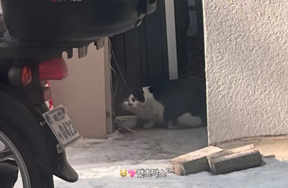 턱시도. 우리 공주가 생각났습니다. 눈은 그쳤지만 바닥은 꽁꽁 얼어서 차량 이동도 천천히 해야 했는데, 눈 쌓인 거리를 가로질러 건물 외벽을 따라 걸어가는 녀석을 보니 뭐라도 줘야할 것 같아서 평소 갖고 다니는 닭가슴살과 사료를 혼합해서 줬습니다.