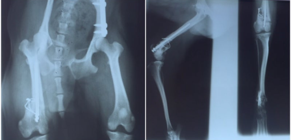 또랑이 뒷다리 둘다 교통사고(?) 후 골절 상태, 시골 병원에서 대충 얼기설기 철사로 묶어놓은 모습