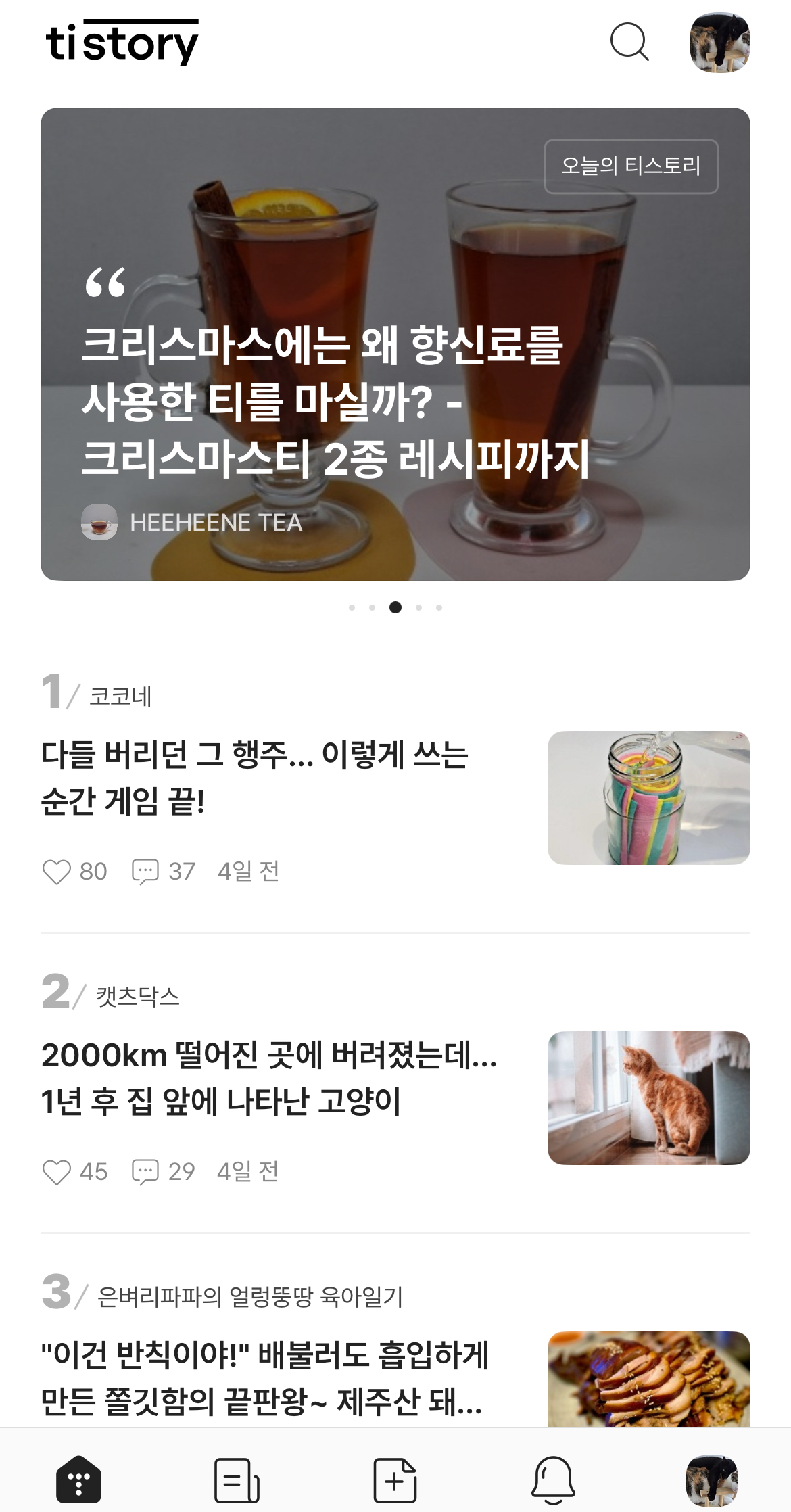 [감사] 고양이 2000km 귀소본능 스토리가 오늘의 티스토리 메인화면에 두 번째로 올라왔어요.