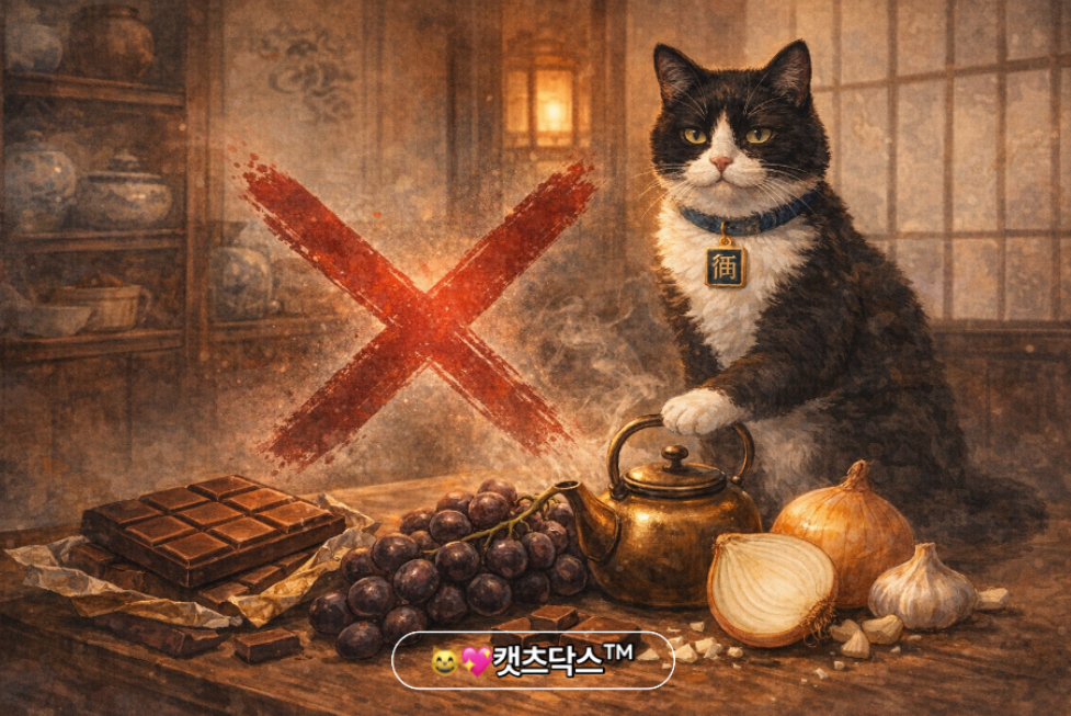 초콜릿에 들어있는 테오브로민 성분은 고양이가 대사할 수 없습니다. 다크초콜릿 한 조각도 위험하며, 섭취 후 46시간 내에 구토, 설사, 경련, 부정맥이 나타납니다. 포도와 건포도는 더 위험합니다. 소량으로도 급성 신부전을 일으키며, 어떤 고양이에게는 포도 23알이 치사량이 될 수 있습니다.