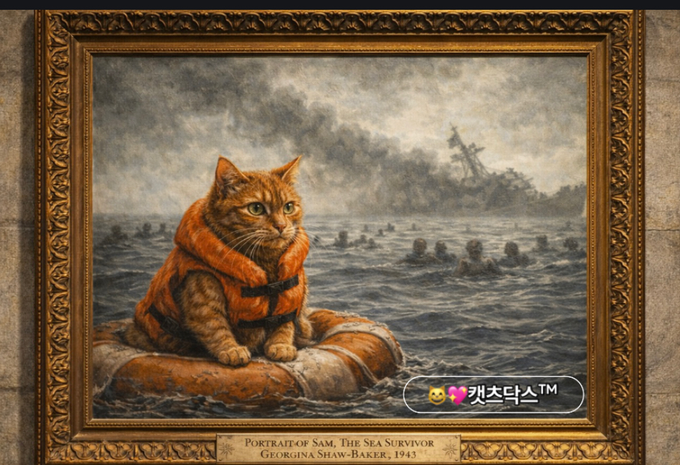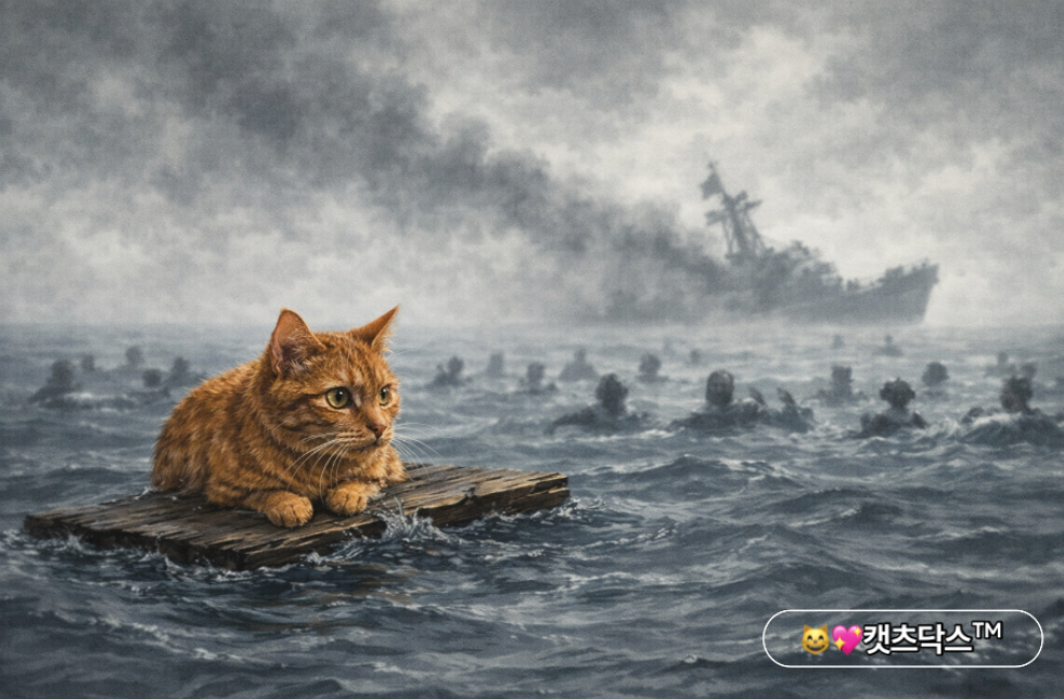 그런데 이 끔찍한 참사 속에서, 표류하는 나무판자 위에 한 마리의 고양이가 앉아 있었습니다. 놀랍게도 이 고양이는 2,200명 중 겨우 114명만이 생존한 대참사를 견뎌냈습니다.